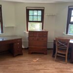 We’ve been refinishing the beautiful Stickley desks and dressers in the bedrooms a little every summer. After being restored they’re fitted with a piece of glass to protect the top surface.